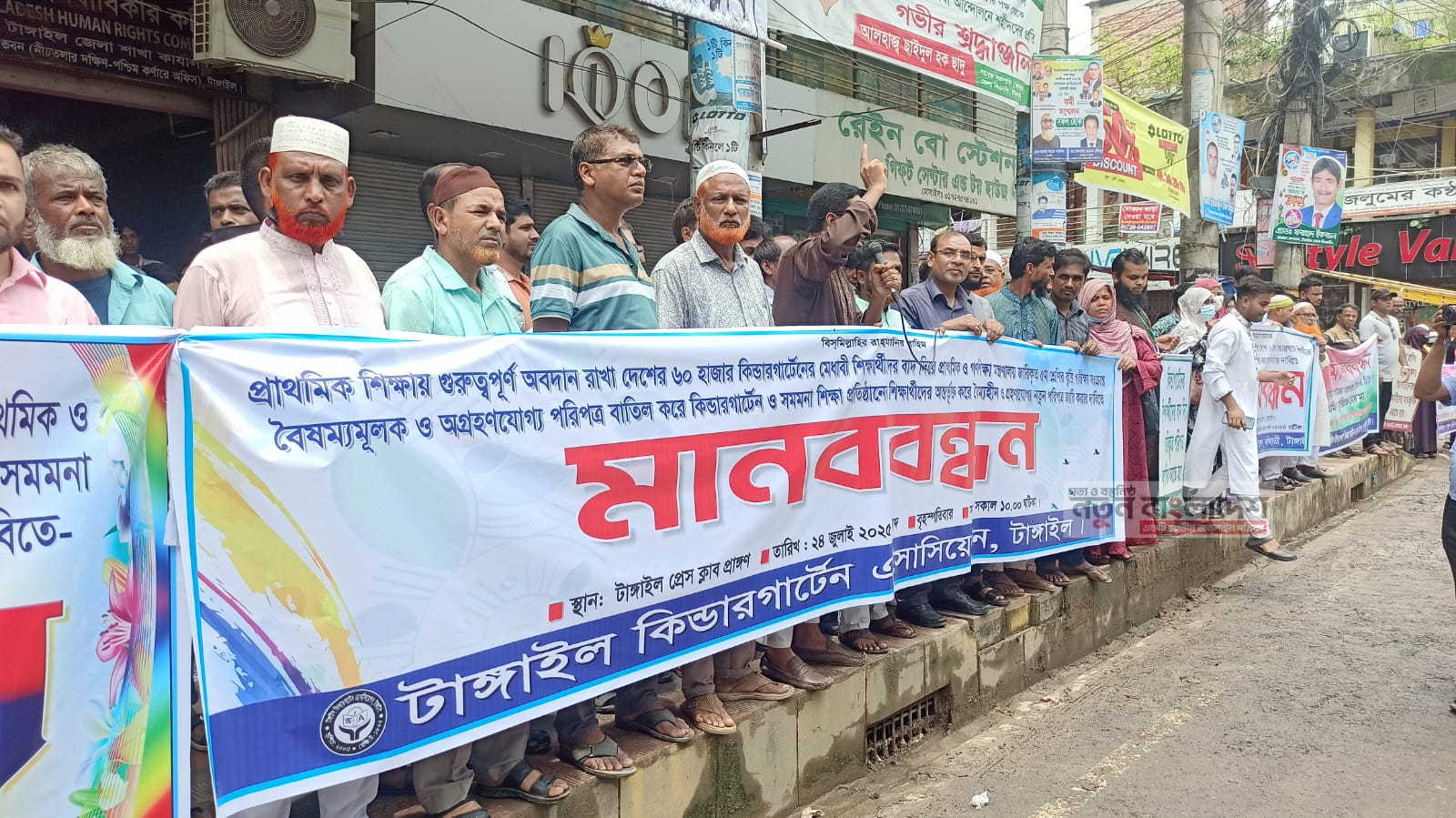 প্রাথমিক শিক্ষায় গুরুত্বপূর্ণ অবদান রাখা দেশের ৬০ হাজার কিন্ডারগার্টেনের মেধাবী শিক্ষার্থীদের বাদ দিয়ে প্রাথমিক ও গণশিক্ষা মন্ত্রণালয় জারিকৃত ৫ম শ্রেণির বৃত্তি পরীক্ষা সংক্রান্ত বৈষম্যমূলক ও অগ্রহণযোগ্য পরিপত্র বাতিল করে কিন্ডারগার্টেন ও সমমনা শিক্ষা প্রতিষ্ঠানে শিক্ষার্থীদের অন্তর্ভুক্ত করে বৈষম্যহীন ও গ্রহণযোগ্য নতুন পরিপত্র জারি করার দাবিতে টাঙ্গাইলে মানববন্ধন অনুষ্ঠিত হয়েছে। বৃহস্পতিবার (২৪ জুলাই) প্রেসক্লাবের সামনে টাঙ্গাইল কিন্ডারগার্টেন এসোসিয়েশন এই মানববন্ধনের আয়োজন করেন।