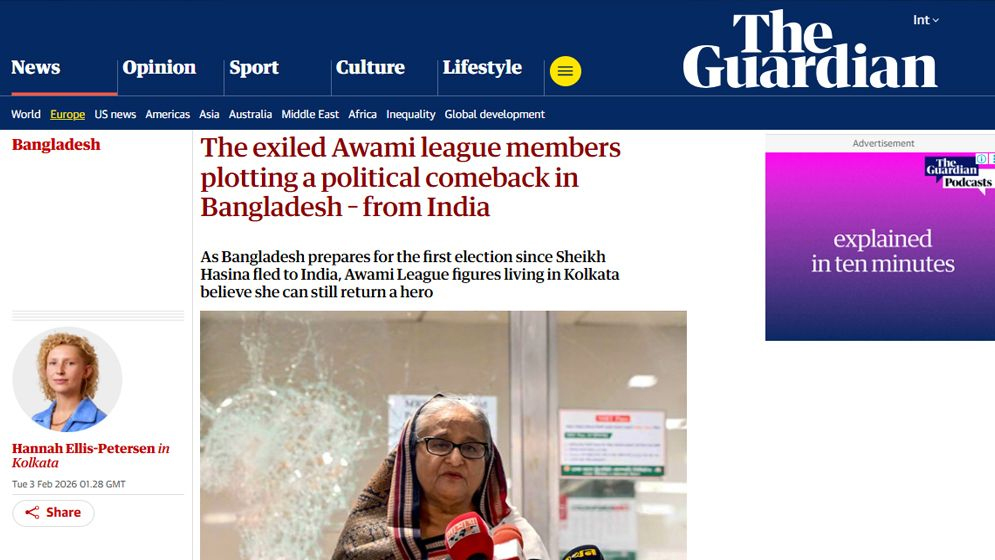গার্ডিয়ান লিখেছে, নির্বাসিত আওয়ামী লীগ নেতাদের প্রত্যাবর্তনের পরিকল্পনা নির্ভর করছে আসন্ন নির্বাচনের সাফল্য-ব্যর্থতার ওপর। তাদের দাবি, এ নির্বাচন দেশে স্থিতিশীলতা বা শান্তি আনবে না, আর শেষ পর্যন্ত মানুষ আবার আওয়ামী লীগের দিকেই ফিরবে।