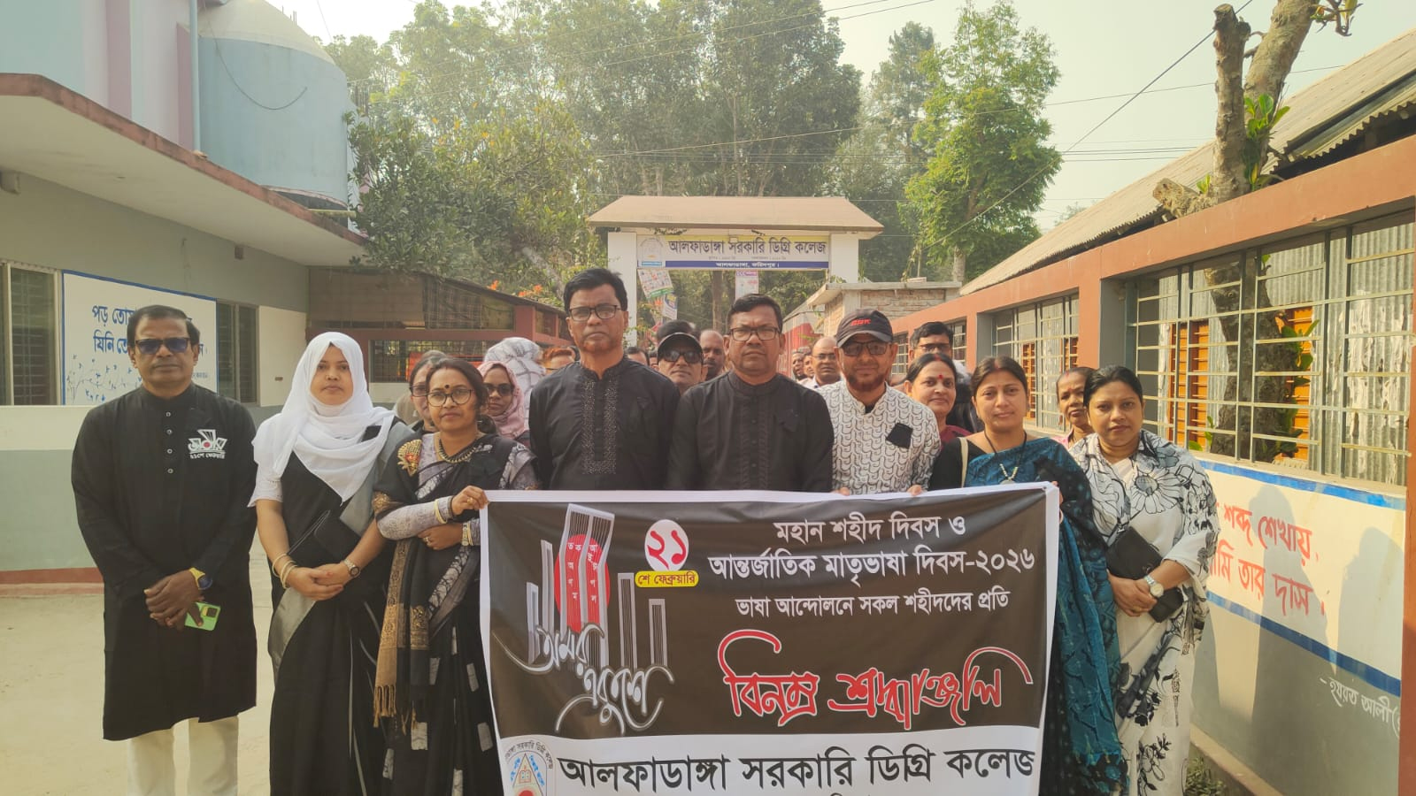 ফরিদপুরের আলফাডাঙ্গা সরকারি ডিগ্রি কলেজে ২১ ফেব্রুয়ারি মহান শহীদ দিবস ও আন্তর্জাতিক মাতৃভাষা দিবস-২০২৬ যথাযোগ্য মর্যাদায় পালিত হয়েছে। কলেজে শহীদদের প্রতি শ্রদ্ধাঞ্জলি, প্রভাত ফেরি, শহীদ মিনারে পুষ্পস্তবক অর্পণ ও দুপুরে হলরুমে আলোচনা সভার মাধ্যমে দিবসের কর্মসূচি সম্পন্ন হয়।